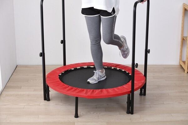 ●全身の筋肉を使うトランポリンは体全体の引き締めに効果的。両手すり付きなので高齢者の方も安心です。雨の日でも、テレビを見ながらでも手軽に運動ができます。