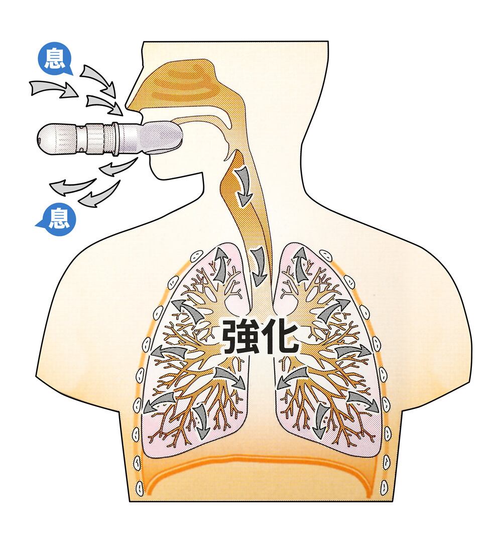 ●口にくわえて呼吸をするだけで約3週間で呼吸筋を強化。